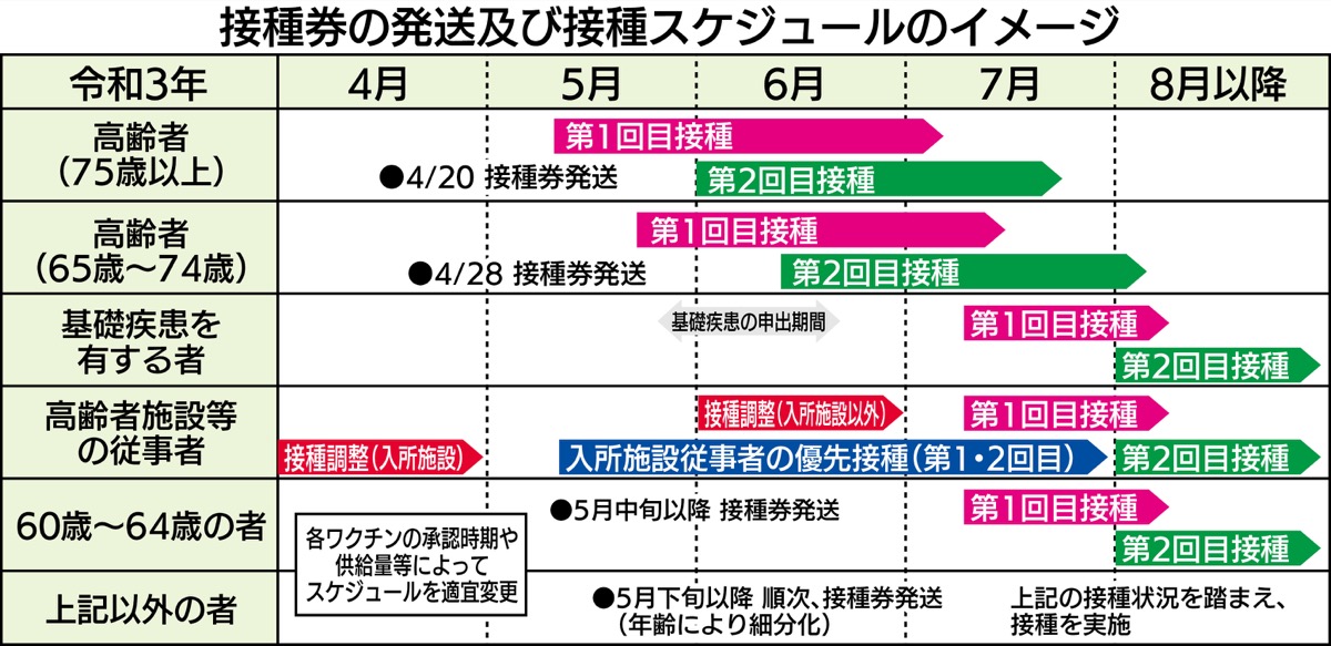 主な接種方法は3つあり、【1】巡回接種(4月12日〜接種開始、特別養護老人ホームや介護老人保健施設等772施設)【2】個別接種(5月10日〜接種開始、600以上の市内医療機関が目標)【3】集団接種(5月11日〜接種開始、中原区は中原市民館)、接種順は表参照。