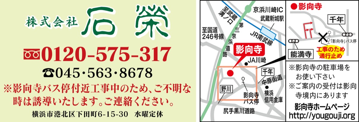 1300年以上の歴史があり、市内初の国史跡に指定された橘樹(たちばな)官衙遺跡群の一つ「影向寺(ようごうじ)」(野川本町)。同寺に隣接する『たちばな銀杏霊園』では4月17日(土)と18日(日)、見学会を開催する。10時から16時まで。