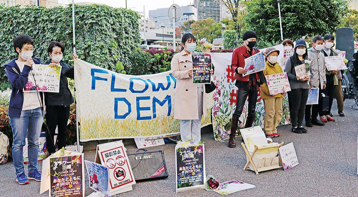 同所では数時間前にヘイトデモが行われていた。フラワーデモの主催者の一人、菊田由佳さん(川崎区在住)は「アイデンティティーを踏みにじる行為で、性差別と根源は同じ。あらゆる差別を花で凌駕したい」と力強く語った。