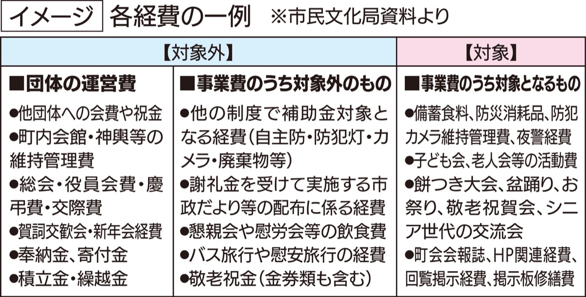 これらの検討の中で市長の施政方針で示された「6月までに具体的な支援の取り組み」については、現在横浜市の取り組みを参考に資金支援についての検討が進められています。横浜市では「地域活動推進費補助金」として町内会・自治会の支援がすでに行われています。その概要は、町内会・自治会加入世帯数に700円を掛けた金額を上限に補助対象経費の3分の1を補助するというもので、所定の申請を行い市が申請の審査を行い、補助金を交付し、町内会・自治会は事業終了後、領収書等を添え報告書を提出する仕組みになっています。加入一世帯700円の単価については、今後の検討課題となると思われますが、補助金支援についてはいよいよ現実味が帯びてきております。補助金対象経費と対象外経費の現時点での大枠イメージは下表のような考えが示されていますが、今後具体的な線引きが明示できるよう検討が続けられており、7月頃を目途に運用が開始できるようスピード感をもって準備が進められています。