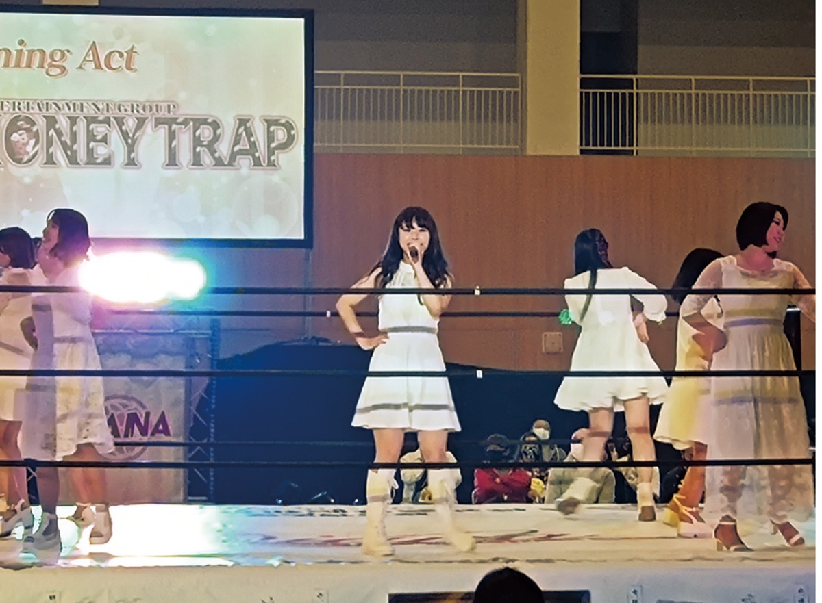 ワールド女子プロレス・ディアナ10周年記念大会に花を添えようと登場したハニートラップのメンバーは、リング上で踊りながら数曲を熱唱。コロナ禍で活動できなかった間も応援し、この日も会場に駆け付けた地元ファンらに感謝のメッセージを届けた。リーダーの梨元陽葵(ひより)さんは「ハニートラップとしての6年間の経験を糧に、謙虚な気持ちを忘れず活動を続けていきたい。人とのつながりを大切にし、皆様に愛されるユニットをめざします」と決意を込めた。