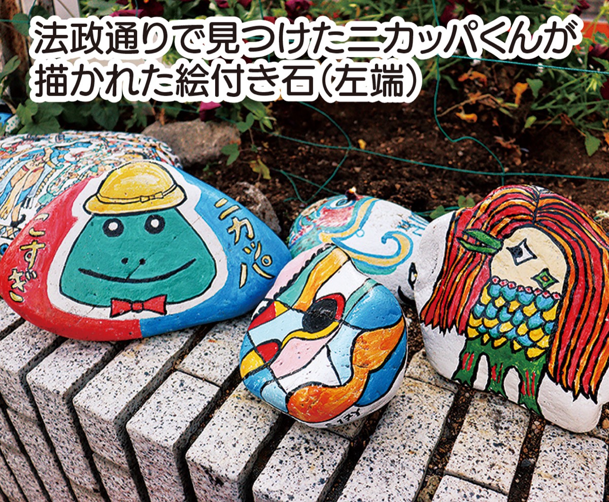 また、小杉エリアではコロナの流行以前から目撃されていた。法政通り商店街のマスコット「ニカッパくん」の周りには、同一人物が描いたと思われる石が並ぶ。同商店街の川島邦博副理事長は「4年ほど前、気づいたら置いてあった。周りに聞いても誰が描いたかわからず、年を重ねるごとに少しずつ増えて、直近ではアマビエも登場した」と話す。