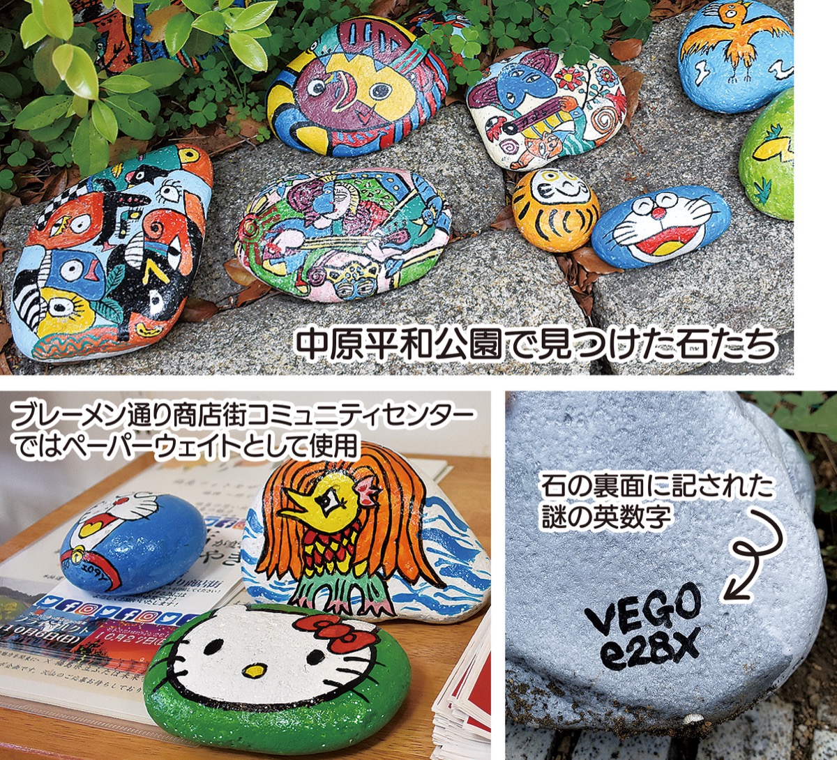 カラフルなイラストを施した石が、区内各地で発見されている。アニメキャラクターやアマビエ、招き猫などが描かれており、誰が、いつ、何の目的で置いたのか、周辺に取材しても全くわからない。ただ、多くの石に共通しているのは裏面に記された「VEGO」という文字。作者のサインなのだろうか。目撃情報をもとに、その謎を追いかけてみた。