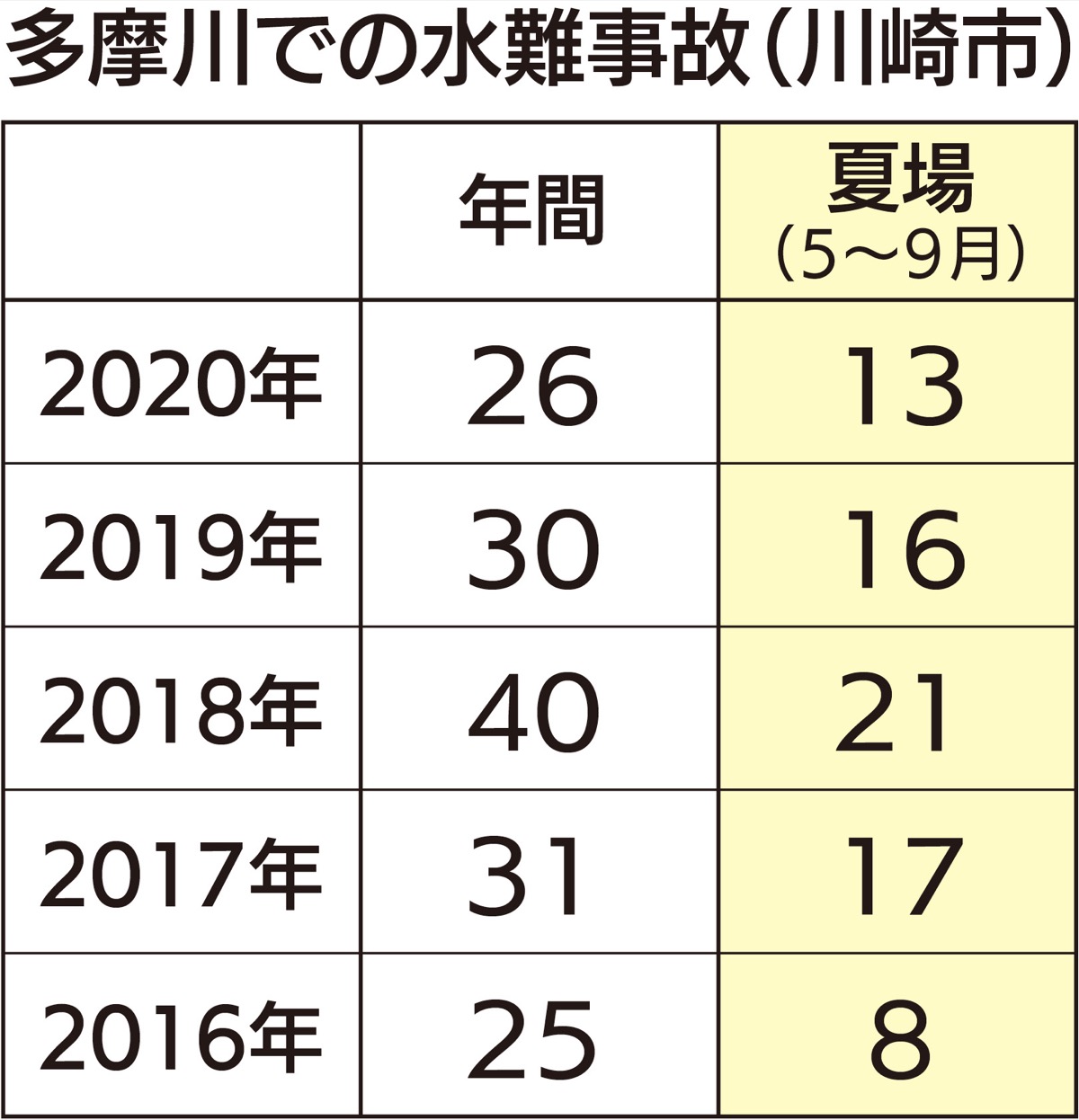 市内多摩川の水難事故に関して、昨年は出動した26件のうち13件が5月から9月に起こった。19年は30件中16件で、18年は40件中21件。中原署によると、被害者は大人が多く、酒に酔って飛び込んだり、溺れた子どもを助けようとして自身が溺れてしまうなどの二次被害がみられるという。