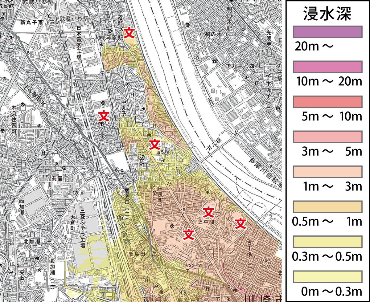市は洪水時の避難所の避難階についても基準を見直し。これまで2階以上に避難するのは避難場所の想定浸水深が2メートル未満の場合だったが、3メートル未満に変更。3階以上は2〜4メートル未満から3〜5メートル未満になった。