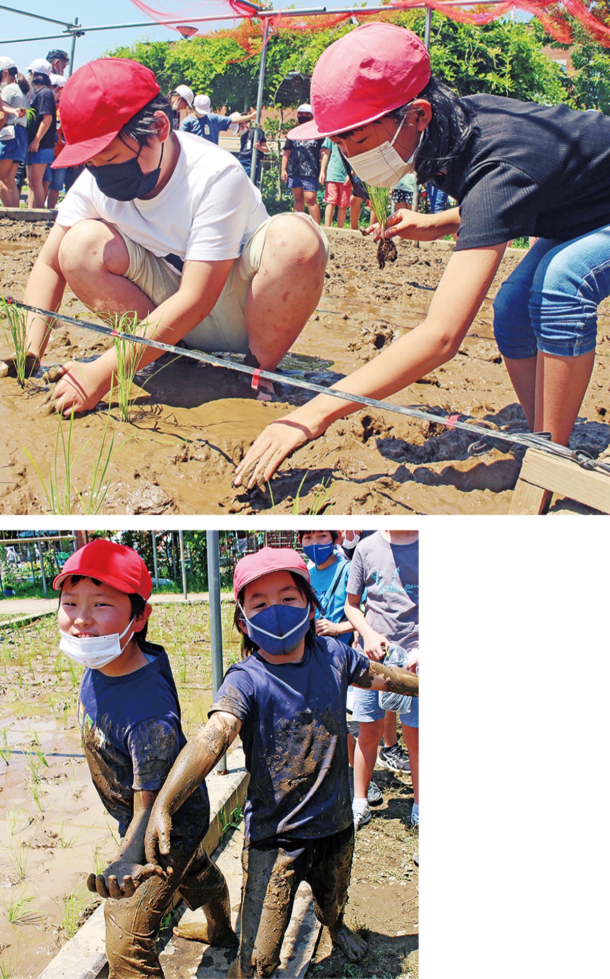 飯草日向さん(10)は「泥がぬるぬるしていて最初は嫌だったけど、慣れたらひんやりして気持ちよかった」と笑顔。佐藤あずみさん(10)は「田植えは初めてで、泥の中に虫がたくさんいてびっくりした。美味しいお米を収穫するのが今から楽しみ」と話した。