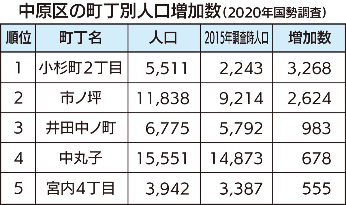 人口増加数は、「小杉町2丁目」が市内1位で3268人(人口総数5511人)。続いて「市ノ坪」が2624人(同1万1838人)で同2位、「井田中ノ町」が983人(同6775人)で同8位だった。小杉町2丁目は増加率(145・7%)で市内3位。