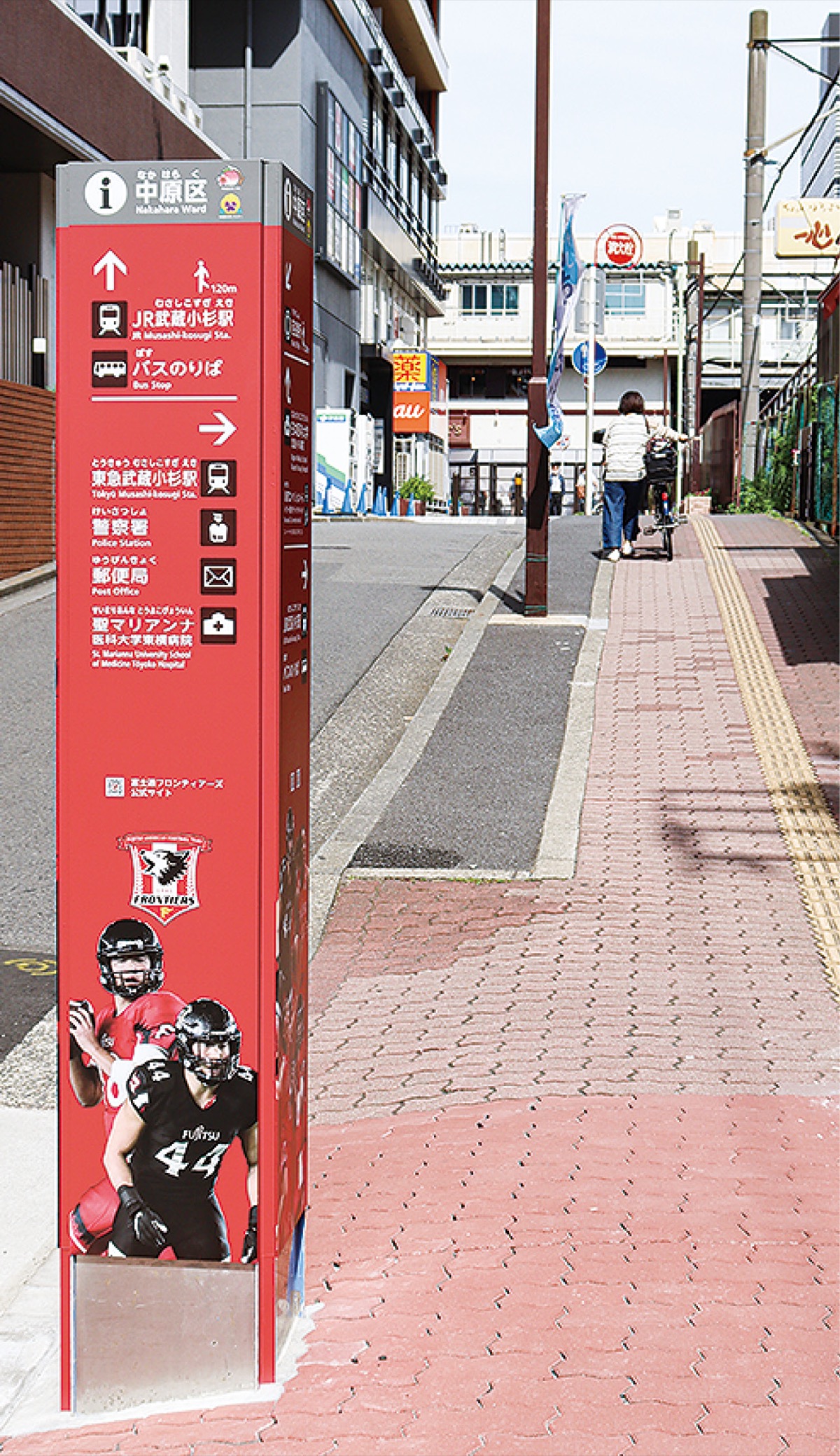JR武蔵小杉駅近くの案内サインが6月28日、中原区を拠点とするアメリカンフットボールチーム「富士通フロンティアーズ」と女子バスケットボールチーム「富士通レッドウェーブ」の仕様になった。