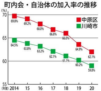 中原区内の人口は26万5千人を超え、世帯数も13万6千と増加の一途をたどるが、町内会の加入率は低下。昨年度は62・1%で、5年前と比べて7%以上減となった。川崎市は7月から、町内会・自治会の活動を支援するための新補助金の受け付けを開始。加入促進の糸口として注目される。