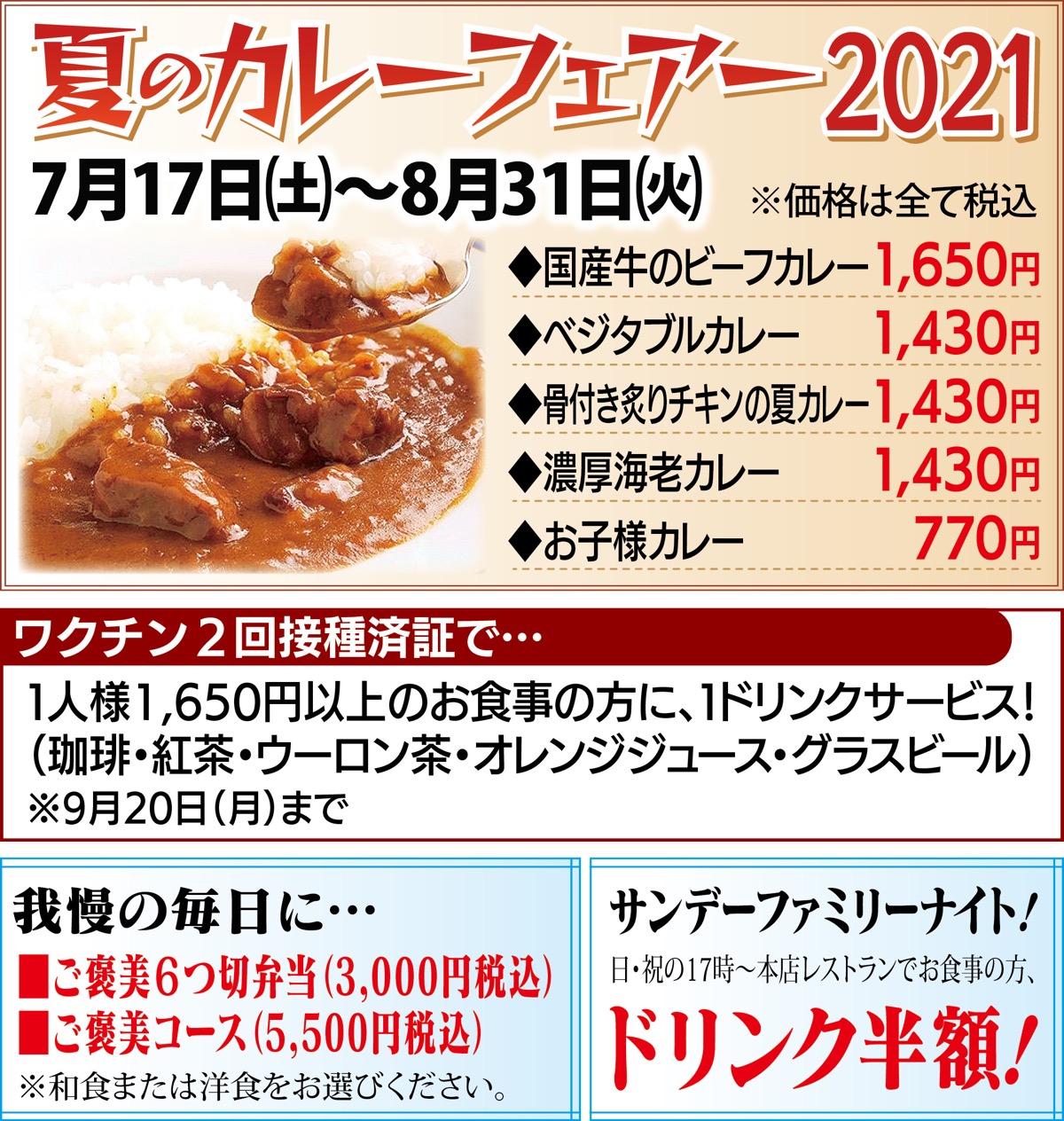 『ホテル精養軒』のレストランラウンジでは、今年もカレーフェアを開催!テレビでも放映された人気メニューだ。ワクチン2回接種済証の提示で1ドリンクサービス。我慢が続く毎日に、ご褒美6つ切弁当(3000円税込)、ご褒美コース(5500円税込)で自分に家族にご褒美を。