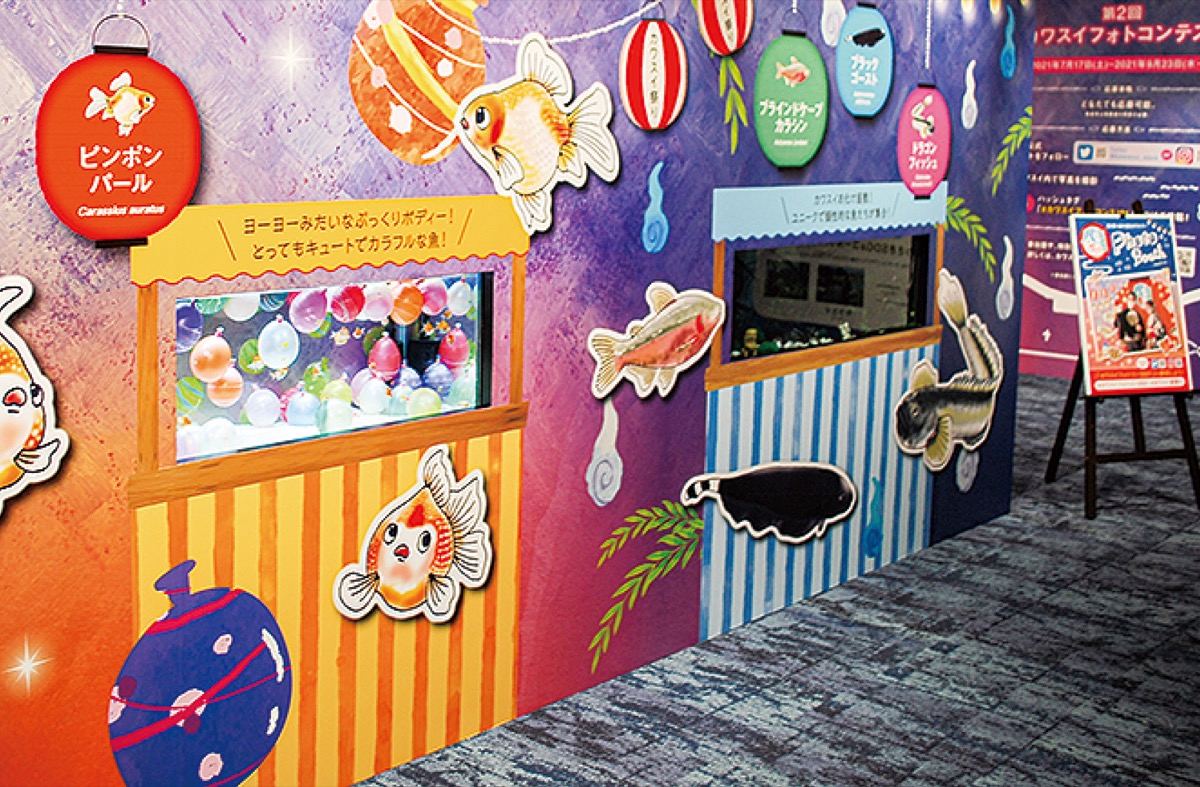カワスイ川崎水族館(川崎区日進町1の11川崎ルフロン9・10階)で特別企画展「さかなたちのカワスイ夏祭り」が開かれている。魚の生態や習性を生かし、夏祭りの屋台になぞらえたユニークな水槽が並ぶ。
