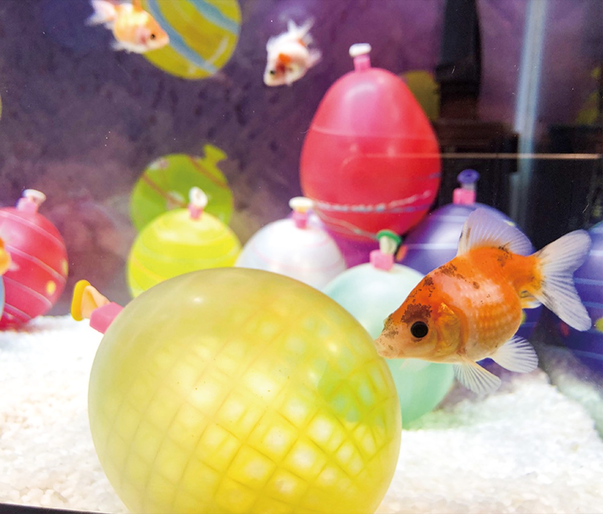 キュウリのような匂いのするアユは、冷やしキュウリになぞらえて展示。魚の色や柄を生かし、ヨーヨーやチョコバナナ、花火に見立てた展示などもあり、夏祭りの雰囲気を味わえる。