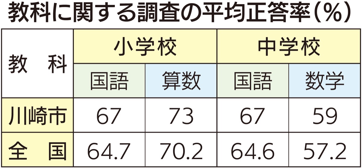 国が今年5月に小学6年生と中学3年生を対象に実施した「全国学力・学習状況調査」の結果が、8月31日に公表された。川崎市の平均正答率は、小中学校ともに全ての科目で全国平均を上回った。
