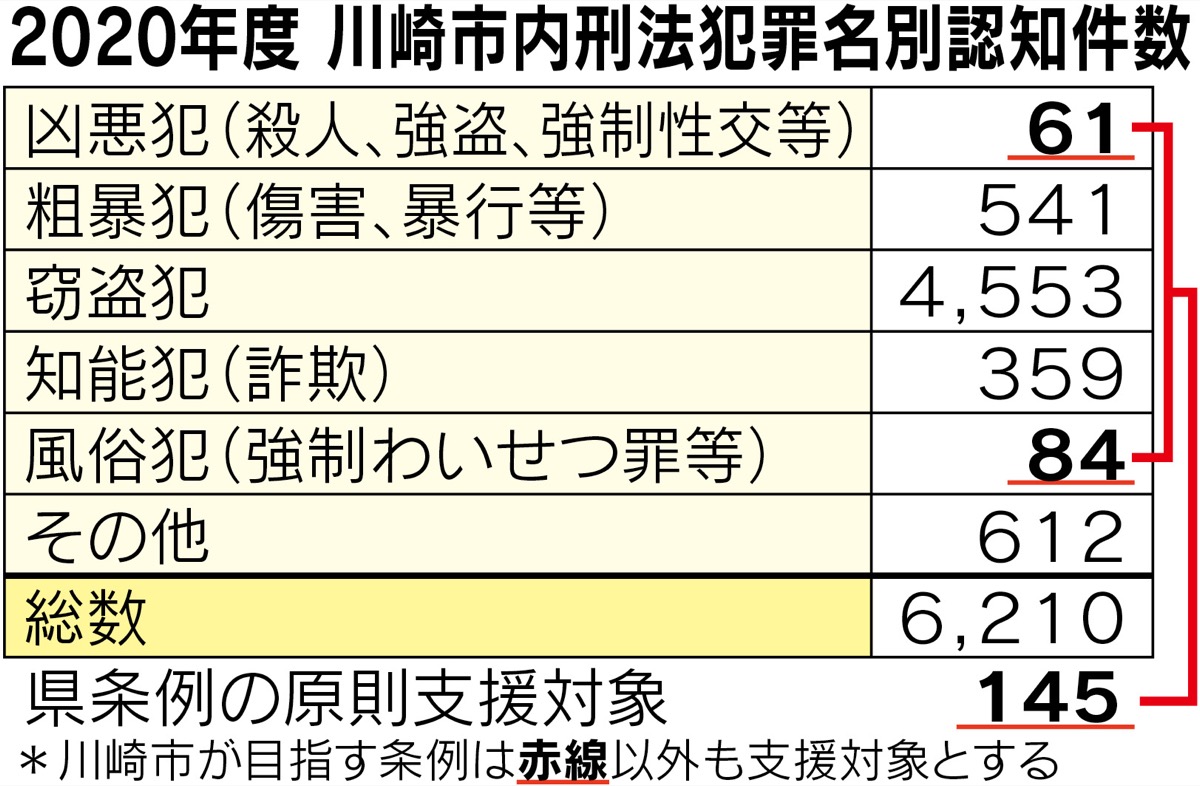 川崎市では19年の登戸刺傷事件などの事件を受け条例制定の動きが進み、昨年度から今年度にかけて有識者会議が実施されている。市が目指す条例は、県の条例の支援対象となっている殺人、重傷傷害、性犯罪等の被害者や家族以外に、暴行や詐欺などの被害者等も対象とする。