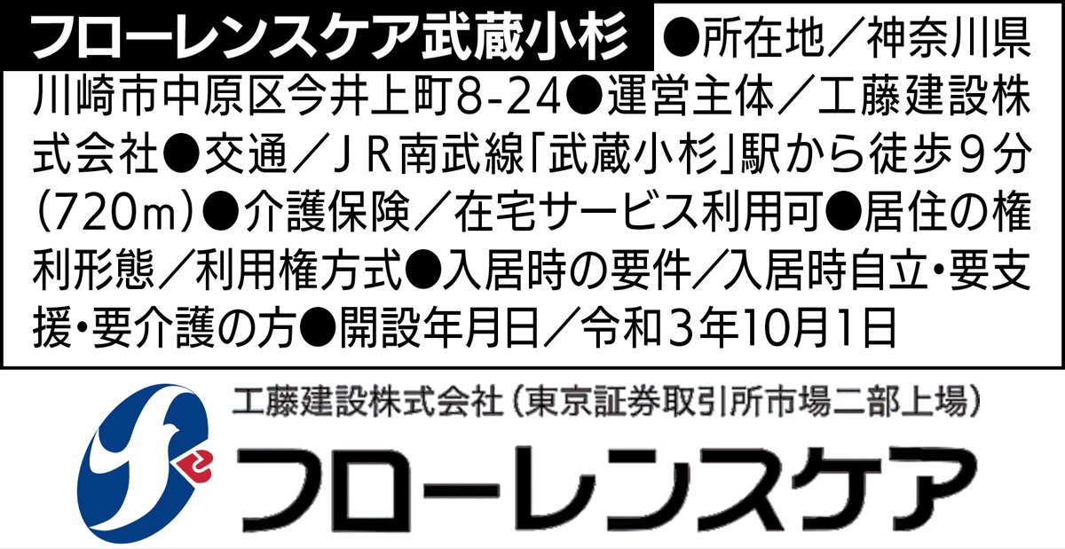 再開発で注目の「武蔵小杉」。JR南武線「武蔵小杉」駅徒歩9分の好立地に住宅型有料老人ホーム「フローレンスケア武蔵小杉」が今年10月新たにオープンする。