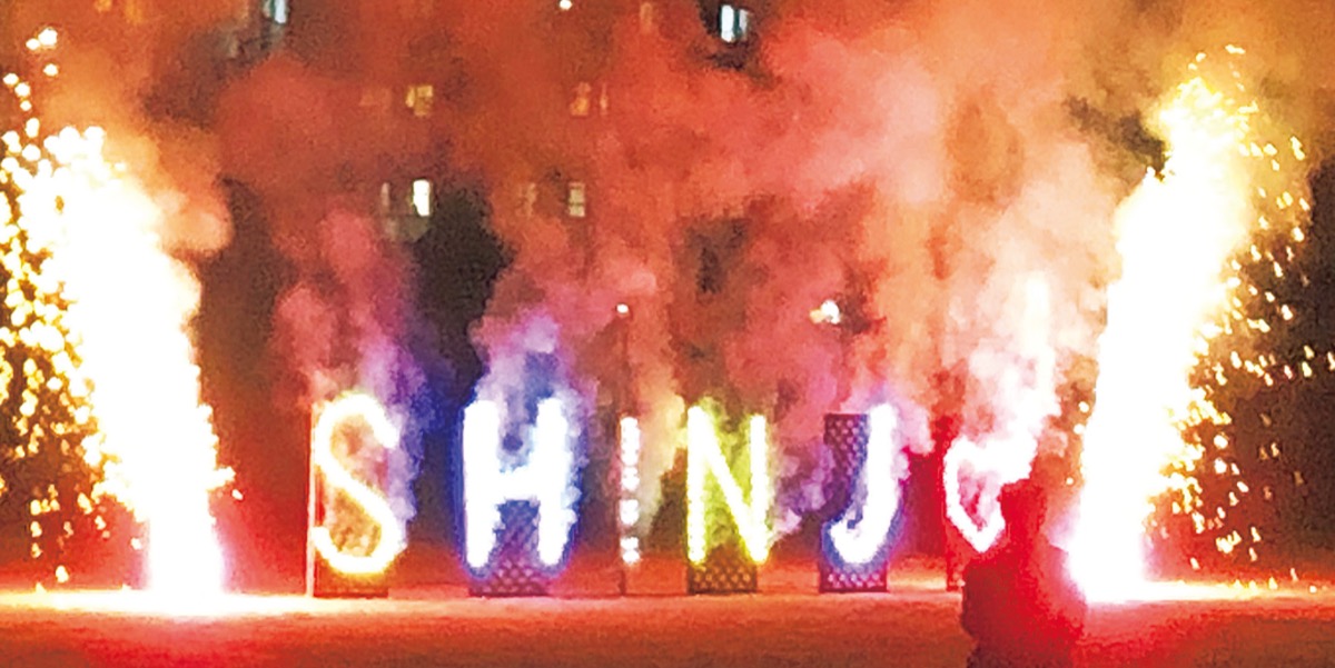 花火は午後5時半から10分間打ち上げられ、フィナーレは「SHINJO」の文字を表した仕掛け花火=写真=が登場して会場を盛り上げた。