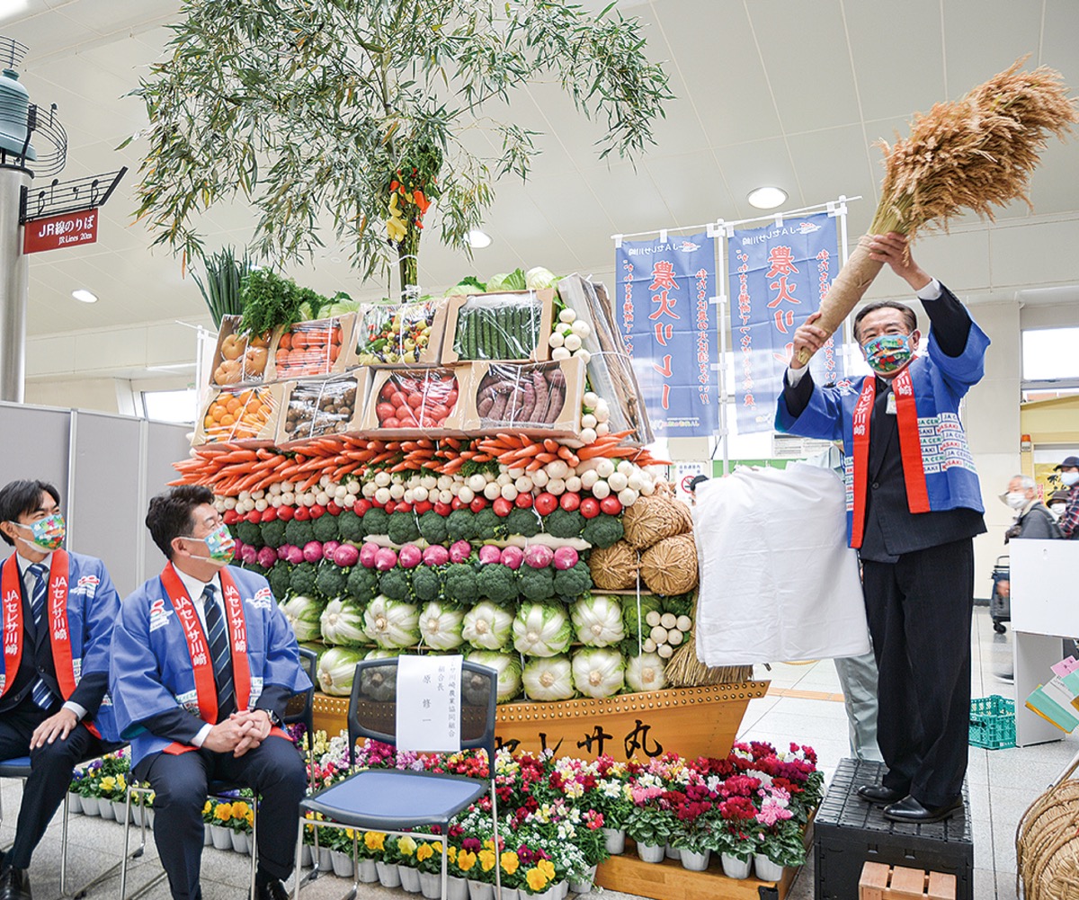 宝船は駅ごとに作り替える。川崎駅では白菜やカキ、パンジーなど24種類の農産物を使い、久末支部(高津区)の生産者約10人が高さ2・5メートル、長さ2・8メートル、幅1・8メートルの大作を製作。原組合長は「イベント名には『農の火を消さない』という意味を込めた。応援の輪を広げていきたい」と思いを話す。