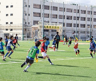 川崎市内外から小学生42人が参加。午前中は、フロンティアズフィールド(上小田中)で、川崎フロンターレのスクール・普及部コーチの指導のもと、ボールを蹴る強さや距離、角度などを工夫しながらドリブルを練習した。