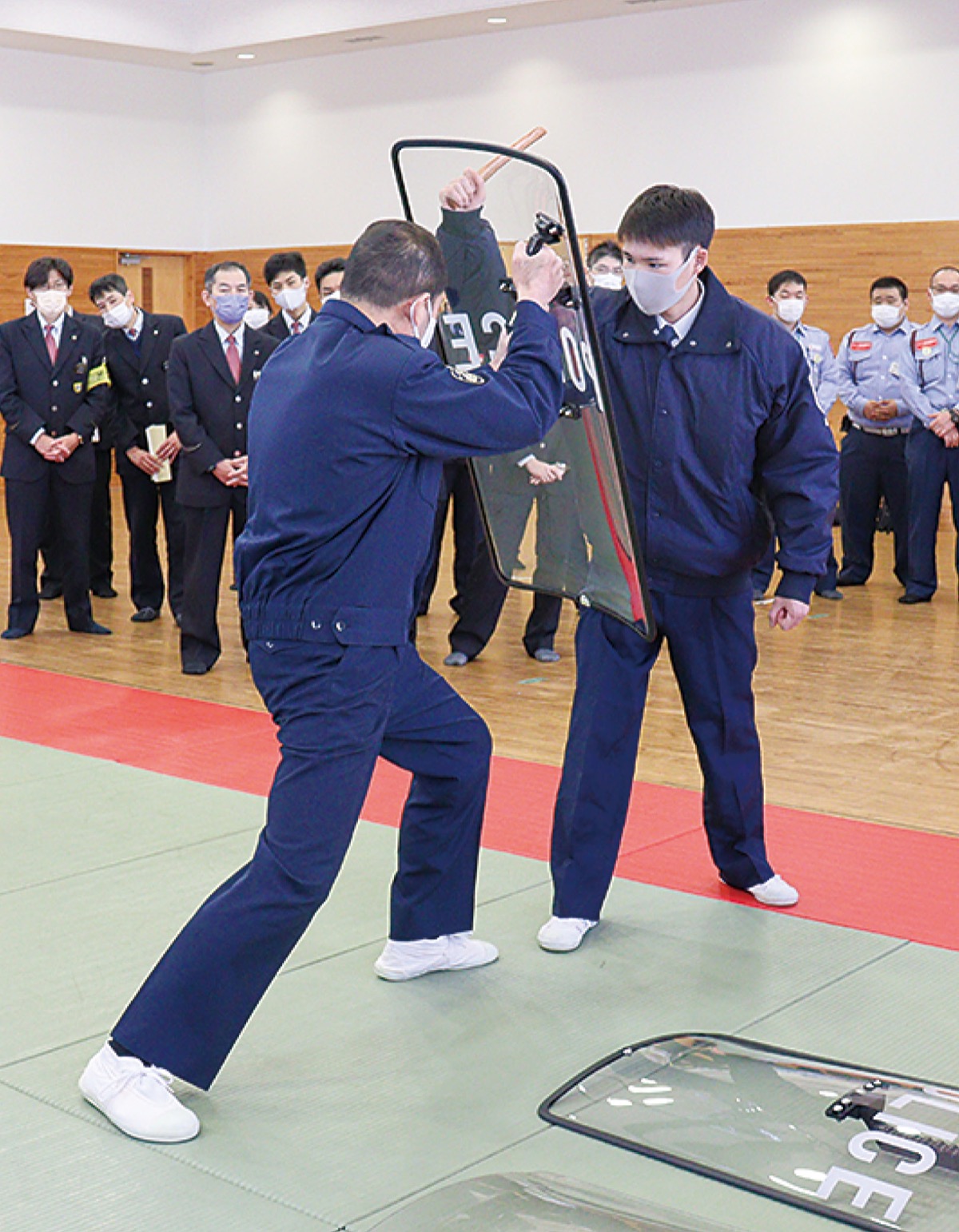 訓練の冒頭、齋藤正晴警備課長は「大切なことは、犯人を捕まえるのではなく、皆さんとお客さんがけがをしないように対応し、正確に警察へ通報すること」と呼びかけ。その上で、さすまたや盾、警杖など装備品の正しい使い方や距離の取り方を署員が指導した。さすまたを持参し、適切な使い方を質問する参加者の姿も見られた。