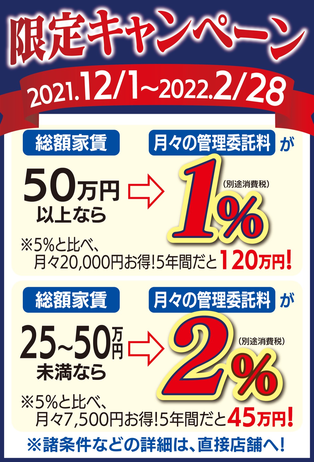 アパートやマンションを経営するオーナーに代わって管理業務を行う「タイセイ・ハウジー」が、月々の管理委託料を1%にする限定キャンペーンを始めた。総額家賃50万円以上のオーナー対象で、25〜50万円未満でも2%に。物件の築年数や構造などは問わず、期間は5年。申込期間は来年2月28日(月)まで。