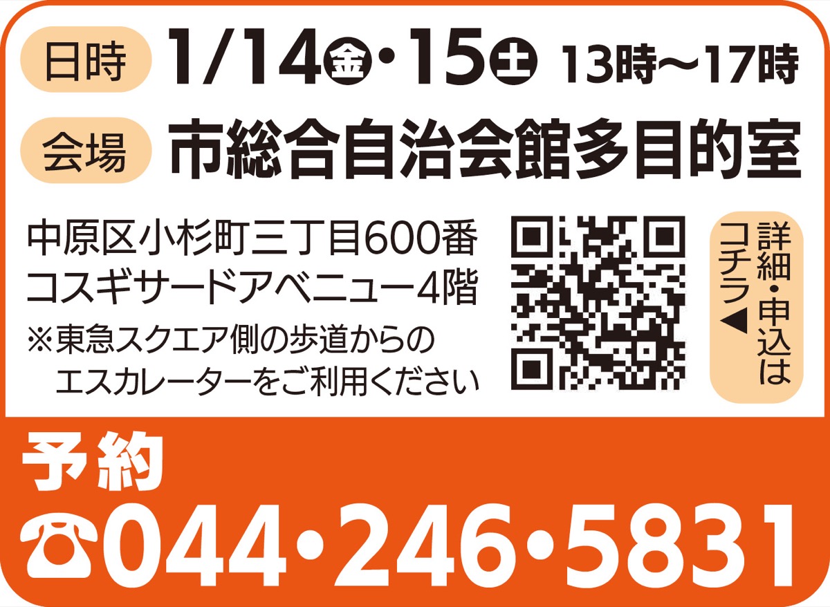 地元の税理士、司法書士、宅建士による「川崎市相続無料相談会」が1月14日(金)、15日(土)に市総合自治会館で開催。要予約。午後1時〜5時。