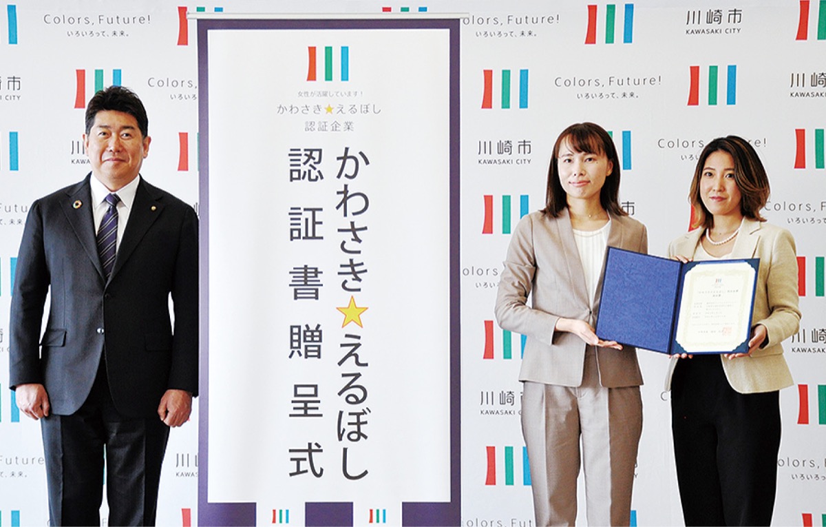 女性の活躍推進やワーク・ライフ・バランスの支援などに取り組む地元企業を川崎市が認証する制度「かわさき☆えるぼし」。2021年度の新規認証企業が1月4日に発表され、中原区から新たに、(株)織戸組(田尻町)、(株)サンヨーシステム(今井上町)、(株)玉川設備(下沼部)の3社が加わった。
