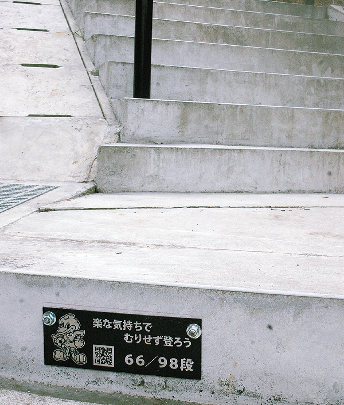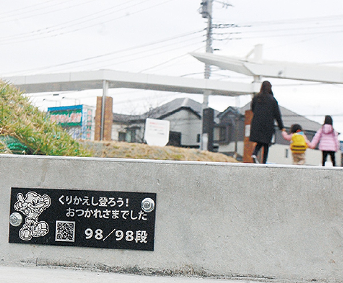 高低差が大きく、ビルにすると6〜7階に相当する同所の階段。プレートは1、26、46、66、98段目に設置された。各プレートには、「半分きたよ!残りもがんばろう」「くりかえし登ろう!おつかれさまでした」など応援の言葉が添えられている。