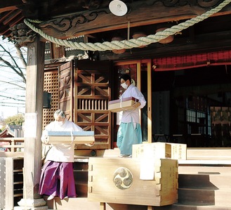 ろうそくが原因で本殿が出火したことを想定。消防署への通報や消火器での初期消火、文化財の搬出などの流れを確認した。山本宮司は「文化財を後世に残していくための意識を改めて持つことができた」と話した。