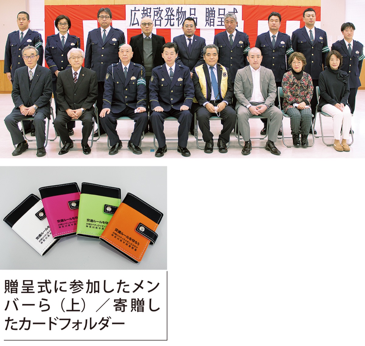 地域に密着したクラブの活動の一環として、警察署への協力を申し出。日常で使う機会が多く、これまで寄贈された実績がないことを理由にカード入れを選んだという。同フォルダーは4色あり、「交通ルールを守ろう」の標語が入る。