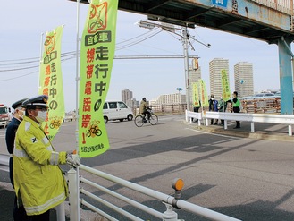区内ではガス橋交差点近くで永山実幸区長をはじめ区の危機管理担当職員、中原署の交通課署員、交通安全協会関係者、ボランティアら15人が沿道に立った。自転車利用者に「交通事故が増えているので気を付けてほしい」と声をかけたり、車の運転者に向けてハンドサインで交通安全意識の向上を訴えた。