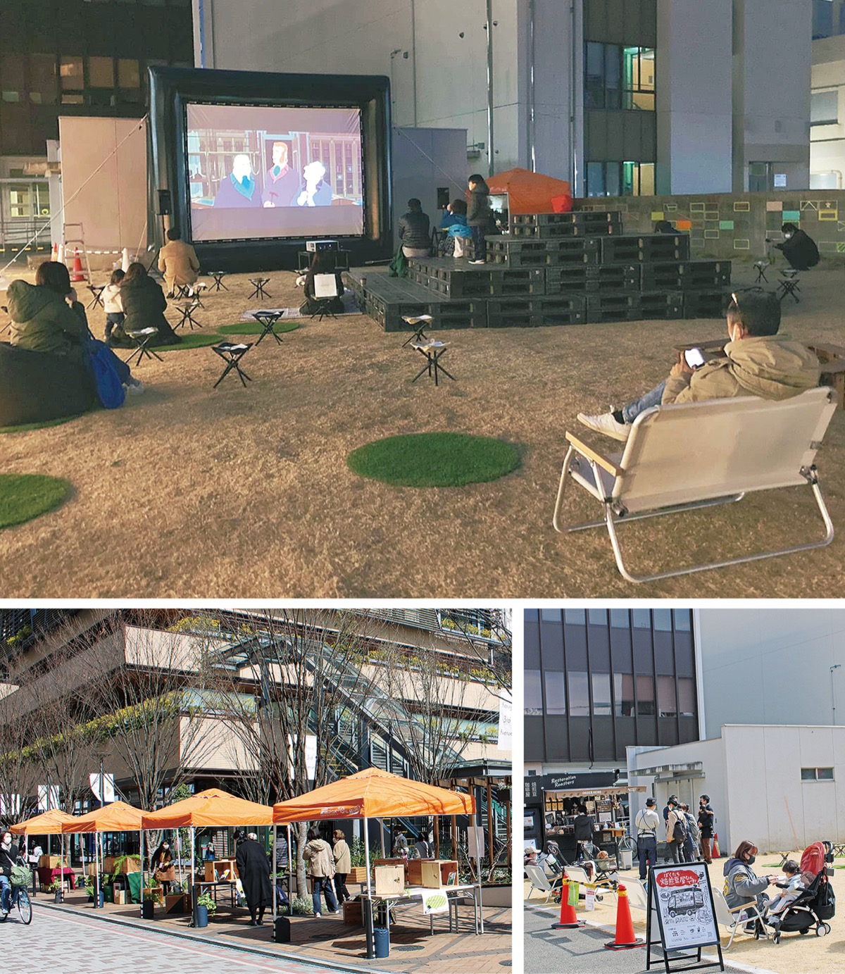 4日の昼下がり、キッチンカーが登場した芝生ひろばは老若男女や親子連れでにぎわいを見せた。ベンチでコーヒーを片手にくつろいでいた小杉町在住の40代の女性は「子どもが幼稚園に行っている間の息抜きに寄った。気軽に利用できるこうした空間が常にあるとうれしい」と歓迎した。夕方からは大型スクリーンを設置して映画上映会も行われた。4〜6日はイトーヨーカドー前の市道で「本箱市」が開かれた。地域住民が読み終えた本を自由に持ち込んだり譲り受けたりできる仕組み。学生ボランティアとしてスタッフを務めた法政大学2年の大竹崇志さん(20)は「本を持ち込んでくれる人も多く、1人1冊差し上げて喜んでもらえた。いろいろな年代の人と触れ合えるのも楽しい」と話した。