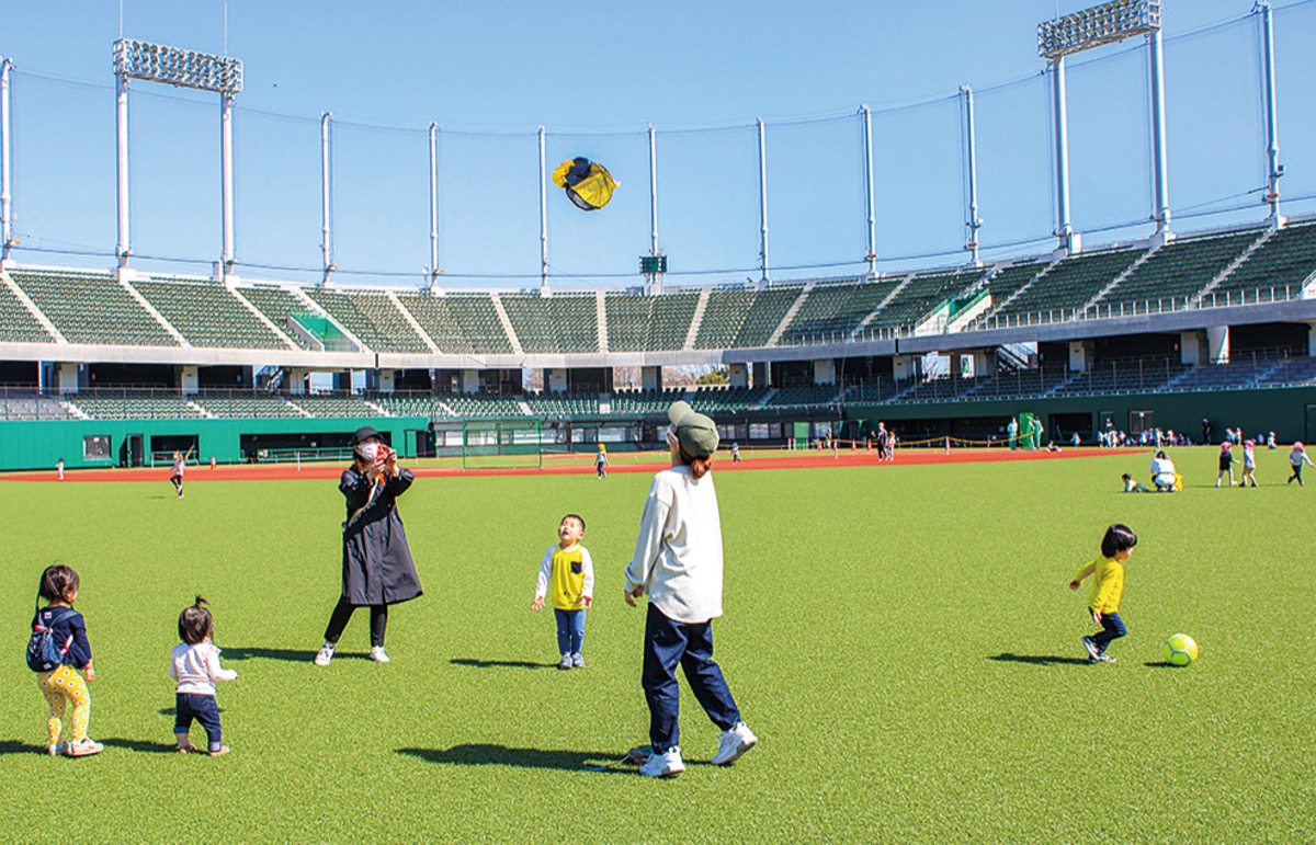 月に2回程度ある内野のメンテナンス日は、野球の試合ができないため、空いている外野エリアを未就学児に向けて開放することにした。実証実験で「球場の中に入って遊びたい」という声が多く上がったことが背景にある。同球場のフィールドの広さは横浜スタジアムを超える県内最大規模で、外野は人工芝になっている。