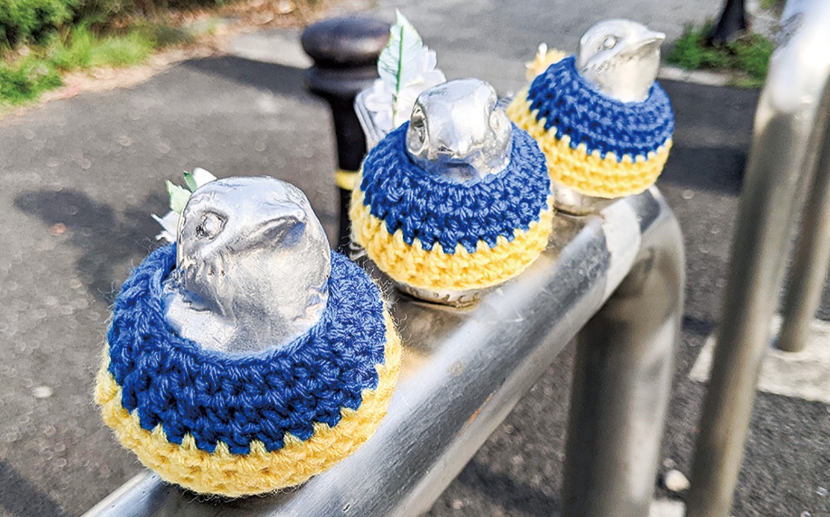 等々力緑地のピコリーノが、ウクライナの国旗をイメージした青と黄の衣装を身にまとっている。SNSには、写真とともに平和を願うメッセージが思い思いに投稿されている。