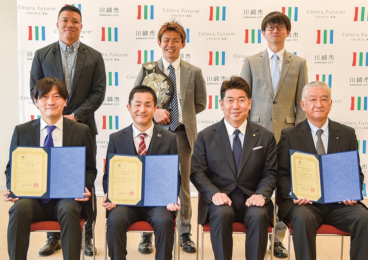 川崎市が新たに創設した「かわさきスポーツアンバサダー」の認証書贈呈式が3月25日、川崎市役所で行われた。認証されたのは、アメリカンフットボールのアサヒビールシルバースター(川崎区)、川崎新田ボクシングジム(多摩区)信号器材(株)卓球部(中原区)の3団体。