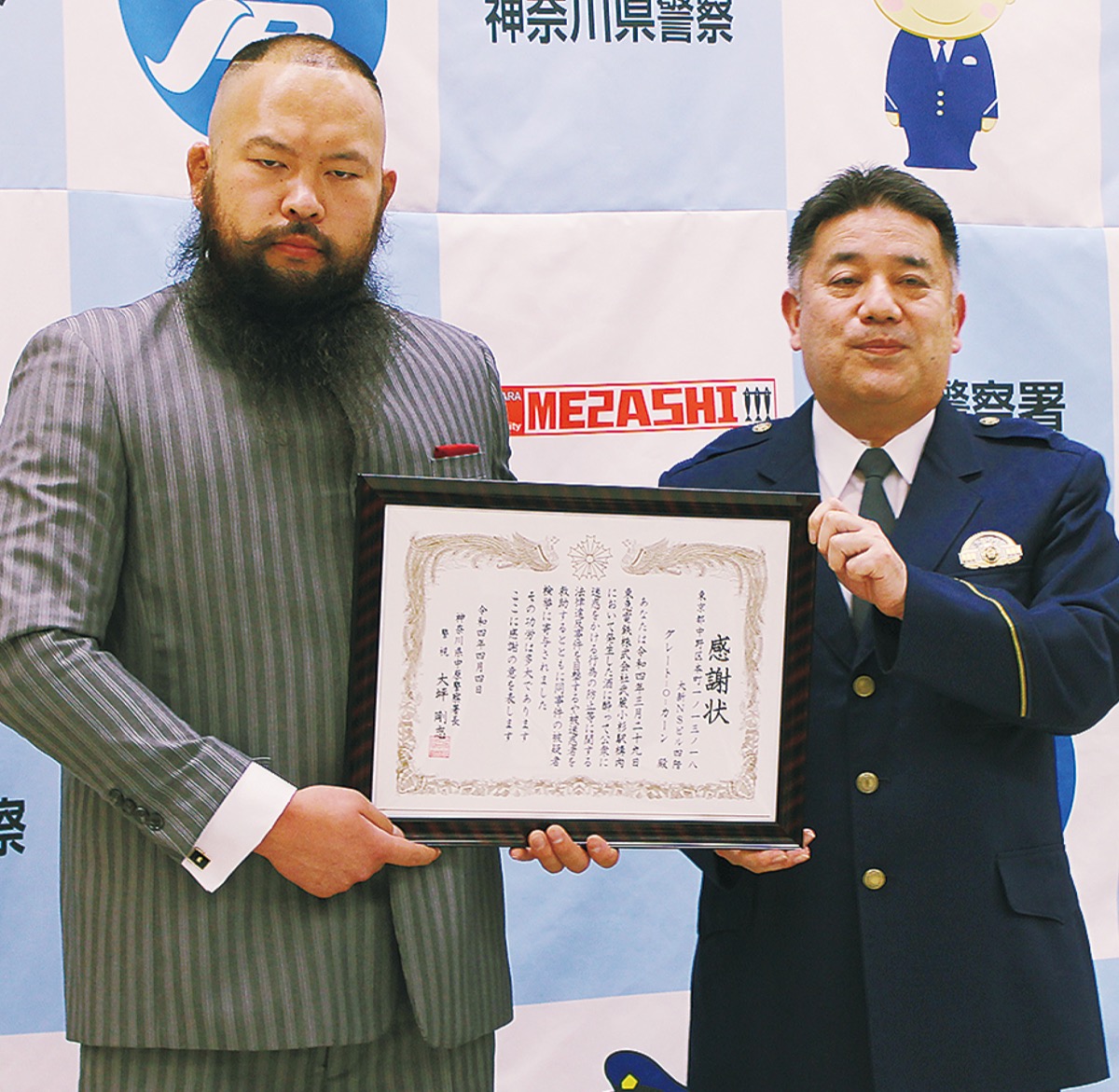 中原警察署(大坪剛志署長)は4月4日、東急武蔵小杉駅構内で女児(10)を暴漢から救った勇敢な行動に対し、新日本プロレスに所属するグレート―O―カーン氏に感謝状を贈った。