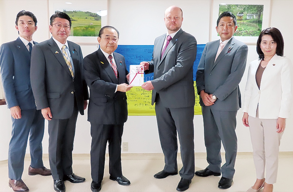 衆議院議員の田中和徳氏は「ウクライナ国民の皆様が戦っている中、少しでも助けたいとの思いでボランティアの方が取り組んだ」と代表してあいさつ。対応した同館のオレクサンドル・セメニューク行使参事官は謝意を示すとともに「自由と民主主義という、日本と本国共通の価値観を守る。我々は占領された領土を取り返す。北方領土を含め、日本の未来も支持している」と応じた。