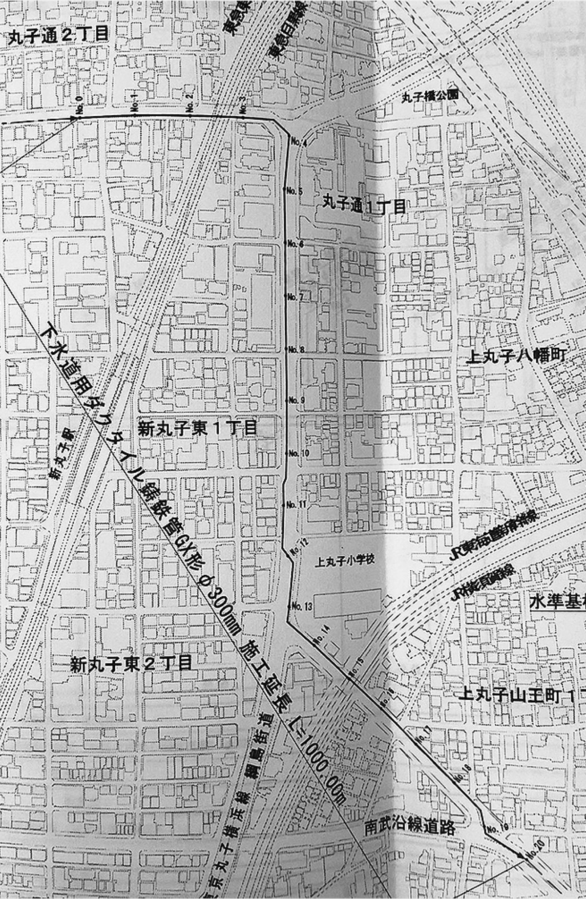 結果としましては、「道路整備自体は概ね終わっているものの、下水管工事のため、上下水道局に1年間工事ヤードとして占用許可を出している」とのことでした。しかしながら、上下水道局に確認すると、その工事は下図のように20区間に分けて順次下水管工事を行っていくとのことで、合流箇所の工期に関しては1カ月も要しないという返答がありました。