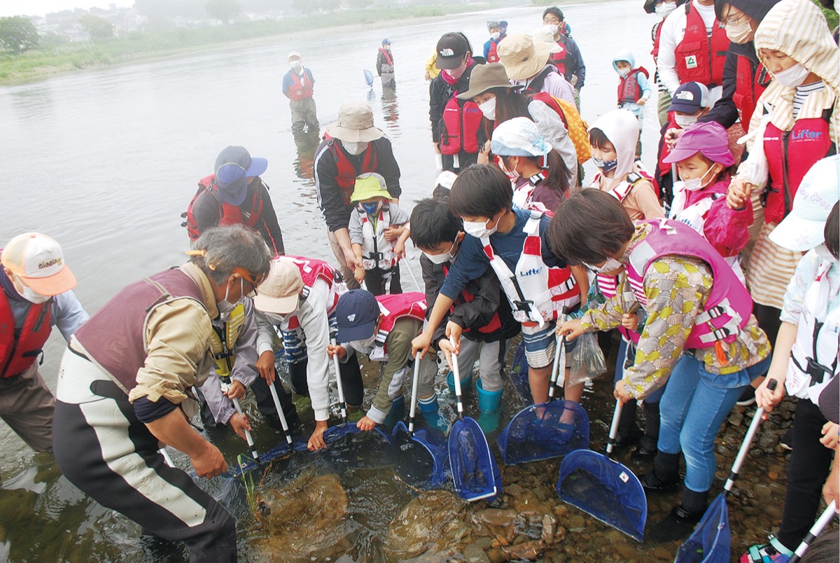 雨模様の天気の中、83人が参加。開会式の後にはライフジャケットを着用して川の中の生き物観察「ガサガサ体験」を行った。観察ポイントで水中の酸素濃度を高めるため、ビニール袋に川の水を入れて曝気を実施。その後、参加者らが一列になってガサガサと音を立てながら歩き、固定した手網の方へ生き物を追い込んで捕まえた。