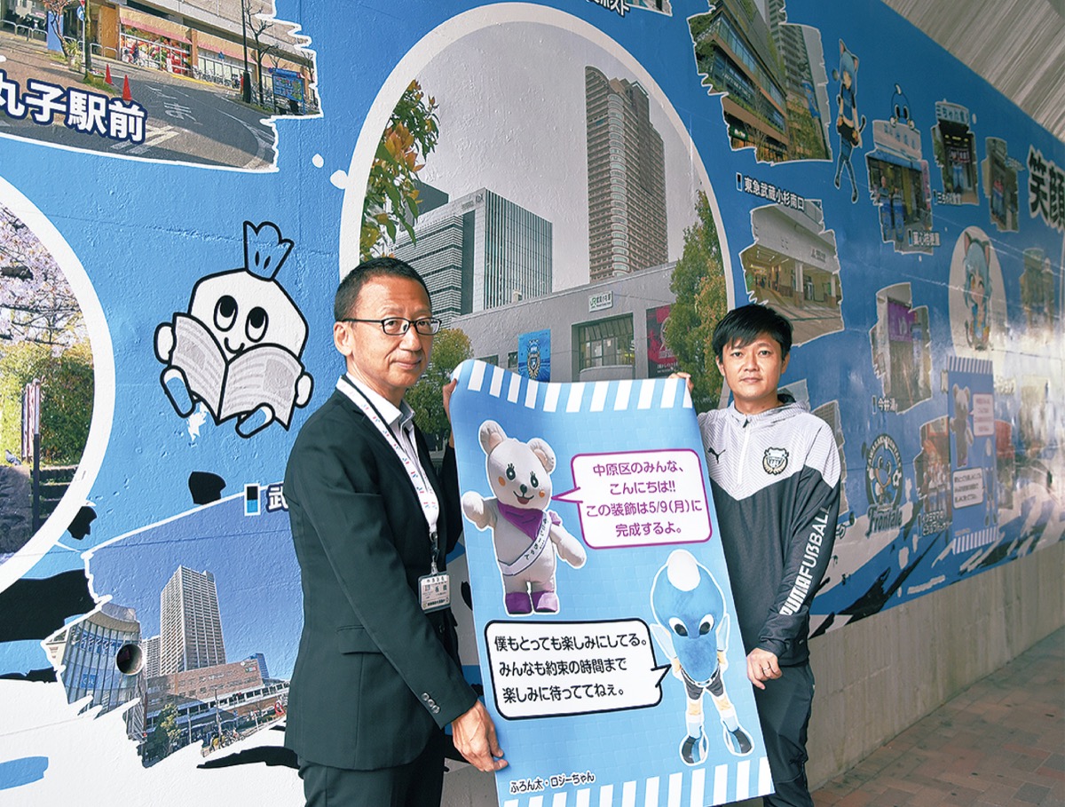 板橋茂夫中原区長は「素晴らしい装飾を作っていただいた。困っていた落書きの防止につながり、中原区の魅力発信にもなる。区民にもフロンターレサポーターにも見てほしい」と話した。