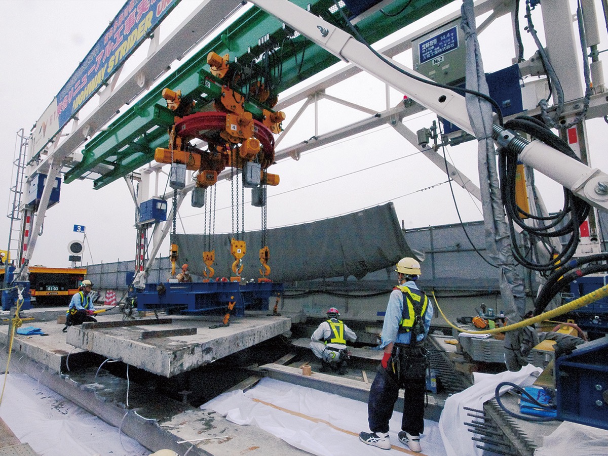 現場は、1日10万台を超える交通集中ポイント。車線規制をしながら進める従来の工法は、大規模な交通渋滞の発生が予想されることから【1】従来の車線幅を縮小させ6車線を確保【2】限られた工事スペースでコンクリート床版を敷設する移動床版架設機を投入、などの工夫で、できる限り、車線数を減らさずに工事が進められている。