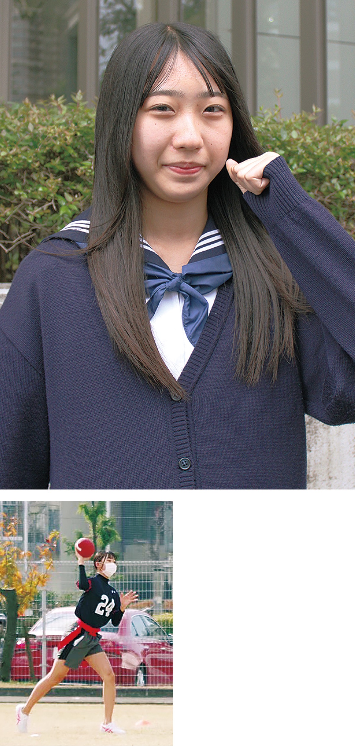 タックルの代わりに腰に付けたフラッグを奪い合う球技で、苅宿小4年のときに授業で体験して楽しさにときめいた。「サッカーやテニス、新体操など、今までやってきたスポーツとは違う面白さに魅了された」。木月大町で活動するチーム「川崎オレンジ」に入部し、男子に交じって汗を流した。中学生では慶應ジュニアユニコーンズに所属。ポジションは攻撃の中心となるQB。代表に選出され「国を背負うことに緊張するけど、全力で楽しみたい気持ちが強い」と意気込む。