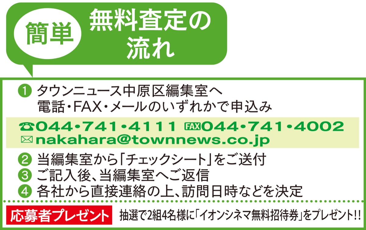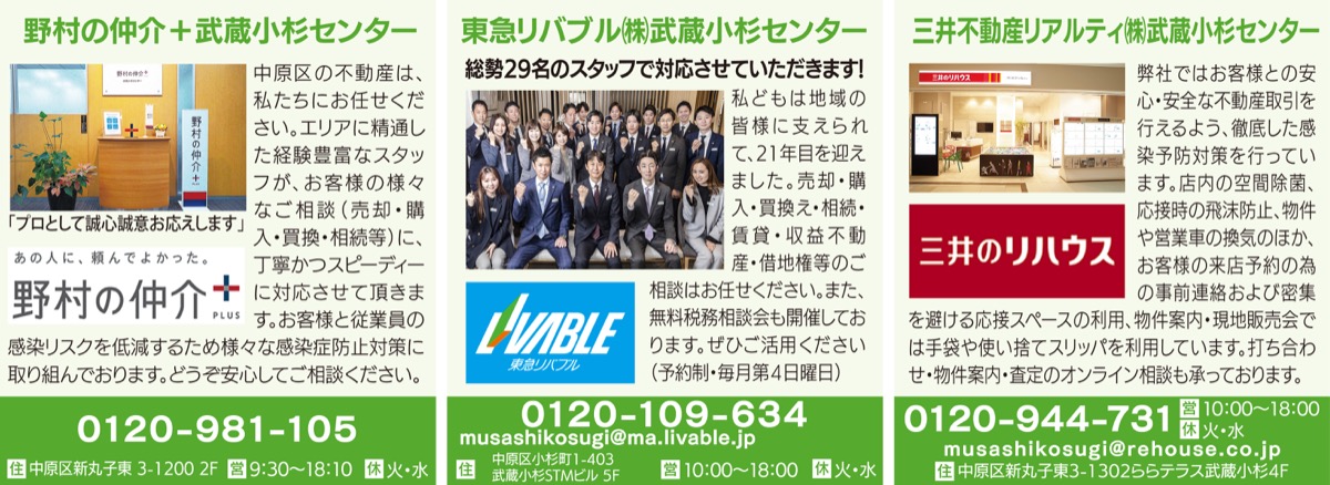 そこで本紙では夏の特別企画として、不動産大手の3社(東急リバブル、野村の仲介+(PLUS)、三井のリハウス※各武蔵小杉センター)と協力し不動産を無料で査定。本紙が取り次ぎ3社一括で依頼することで、自宅の資産価値を比較できるだけでなく、各社の視点で今後の住まいや不動産全般に関する相談も可能だ。まずは当編集室へお問合せを(下記参照)。