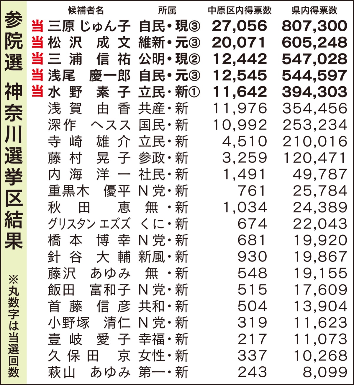 参議院議員選挙の投開票が7月10日に行われた。改選4と欠員補充1の計5議席を過去最多の22人で争った神奈川選挙区は、自民党の現職・三原じゅん子氏(57)が約80万7千票を獲得し、トップ当選。以下、日本維新の会の元職・松沢成文氏(64)、公明党の現職・三浦信祐氏(47)、自民党の元職・浅尾慶一郎氏(58)、立憲民主党の新人・水野素子氏(52)が当選した。