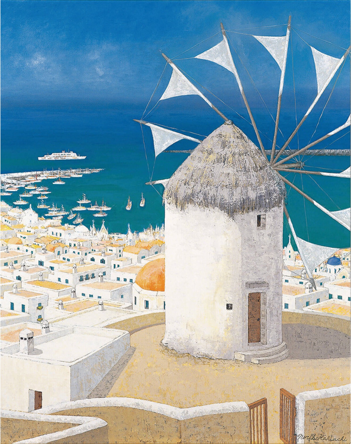 「エーゲ海に浮かぶ白い宝石」と称されるミコノス島は、世界有数のリゾート地。青空と海、白で統一された街並みが美しい。垣内さんは「想像の翼を広げて、少しでも明るい気持ちになってもらえたら」と話す。
