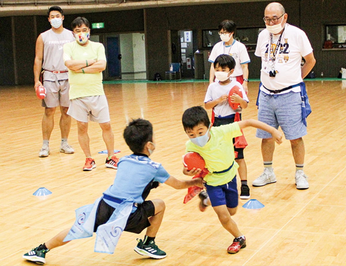 同スポーツはタックルの代わりに、腰に付けたフラッグを奪い合ってボールを運ぶ。児童らは低学年と中高学年に分かれ、ボールを持って走る動きやパス、味方のプレーヤーを守るブロックなどを体験。チームが協力してゴールを目指す楽しさを学んだ。相手チームの守備を抜けて得点すると、周囲から「ナイスラン」などの声が飛んだ。