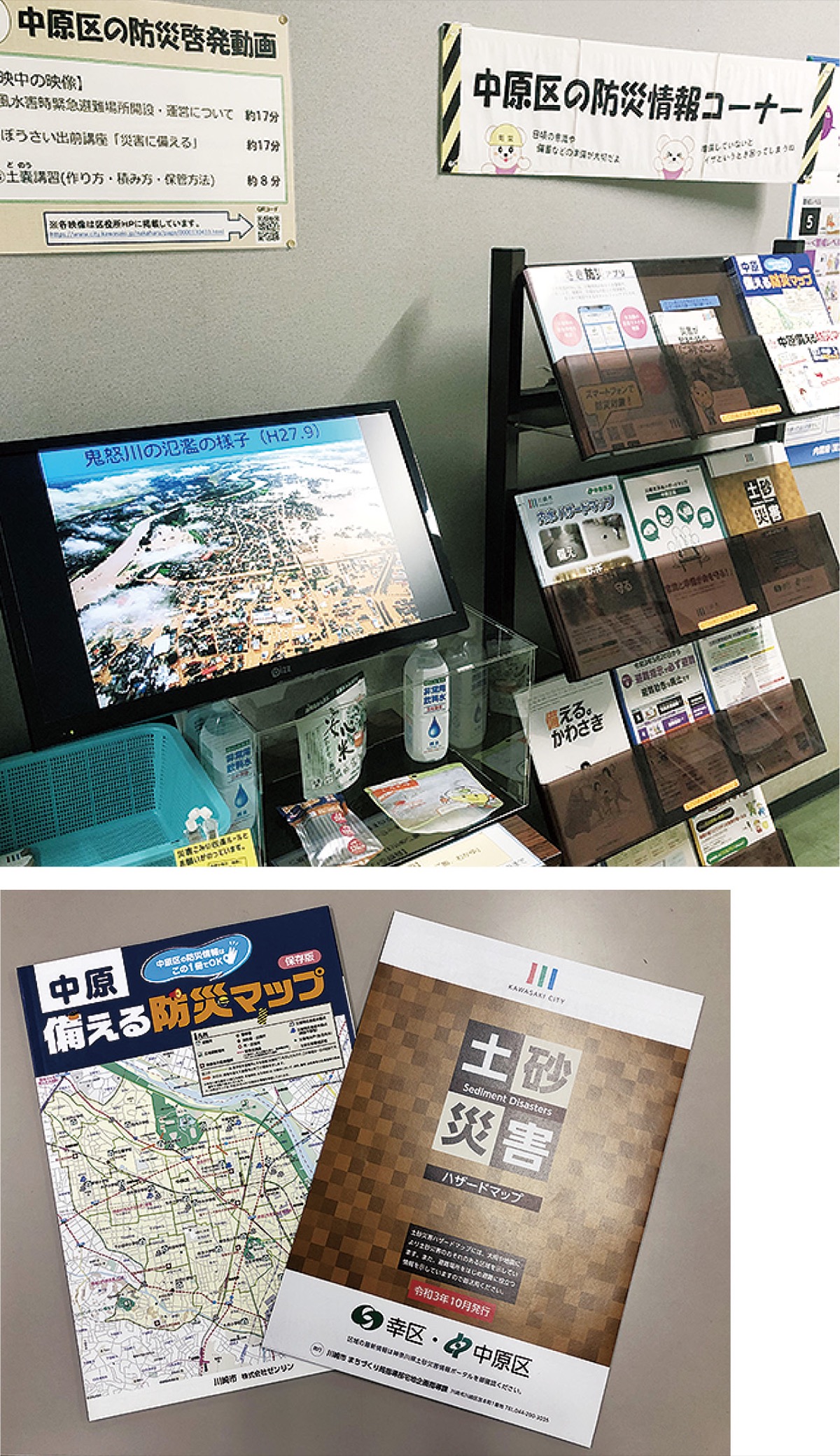 中原区役所4階の防災情報コーナーでは、動画や資料などで防災への啓発活動を行っている。