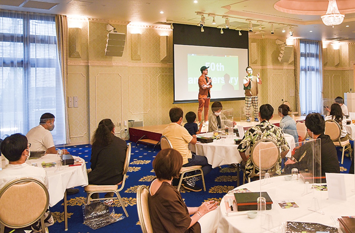 当日は、半世紀の道のりを映像にまとめ披露したほか、店舗に関するクイズなどを出題し盛り上がった。先代の頃から利用しているという山本徹司さん(77)は「今の代表と息子が同級生という縁から通い始めた。他にはない品揃えが好きで、月に1度訪れる」、26年通う松岡明男さん(47)は「洋服のセンスが好みに合い、長く通っている」と話していた。