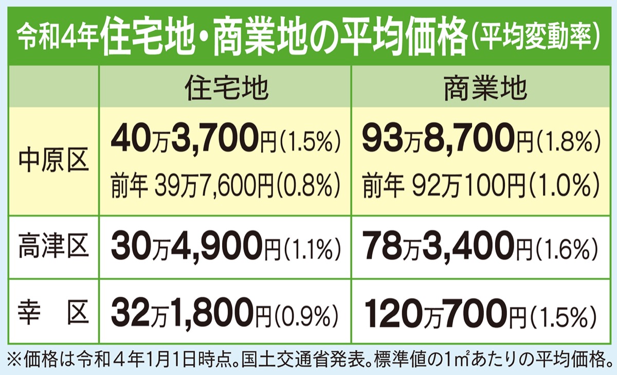 川崎市の住宅地の価格変動率は0・6%増。中原区は1・5%増で、10年連続で上昇。武蔵小杉を中心に、戸建て需要が高く、新築中古とも売れている一方、売り物件の情報が少ないことが土地の価格上昇につながっているとの見方もある。商業地の変動率も1・8%で、市内で最も高い。