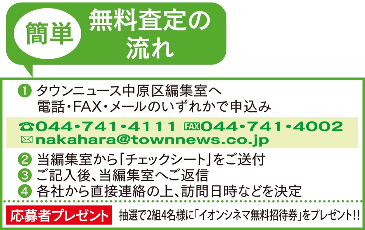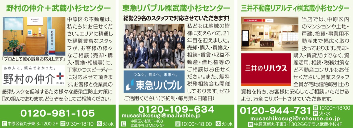 そこで本紙では秋の特別企画として、不動産大手の3社(東急リバブル、野村の仲介+(PLUS)、三井のリハウス※各武蔵小杉センター)と協力し不動産を無料で査定。本紙が取り次ぎ3社一括で依頼することで、自宅の資産価値を比較できるだけでなく、各社の視点で今後の住まいや不動産全般に関する相談も可能だ。まずは当編集室へお問合せを(下記参照)。