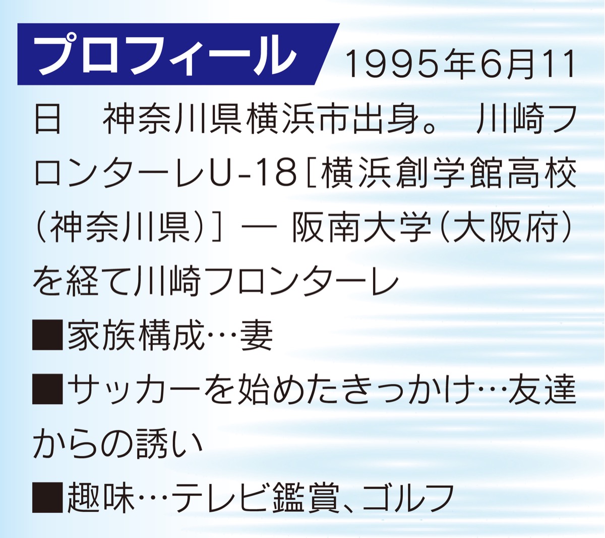 今シーズンから中村憲剛さんから背番号「14」を引き継いだ、新しい「フロンターレの顔」。開幕前やシーズン始まりこそ「ピッチ内外で貢献度の高い中村さんのようになれるか」と、思い悩むこともあったが、試合数を重ねる中で「自分の存在を示すことが大事」であると気付き、重圧から解き放たれたという。得点とアシストに貢献するプレーが持ち味。ここ最近はトレーニングの中で、その感覚が研ぎ澄まされてきていると実感する。らしさを発揮したのは、9月10日のサンフレッチェ広島戦。「プレーに余裕が出てきていることも感じた」。得点とアシストの合計は、目標に掲げた10をクリアした。「15以上は獲りたい」と、さらなる高みを目指す。